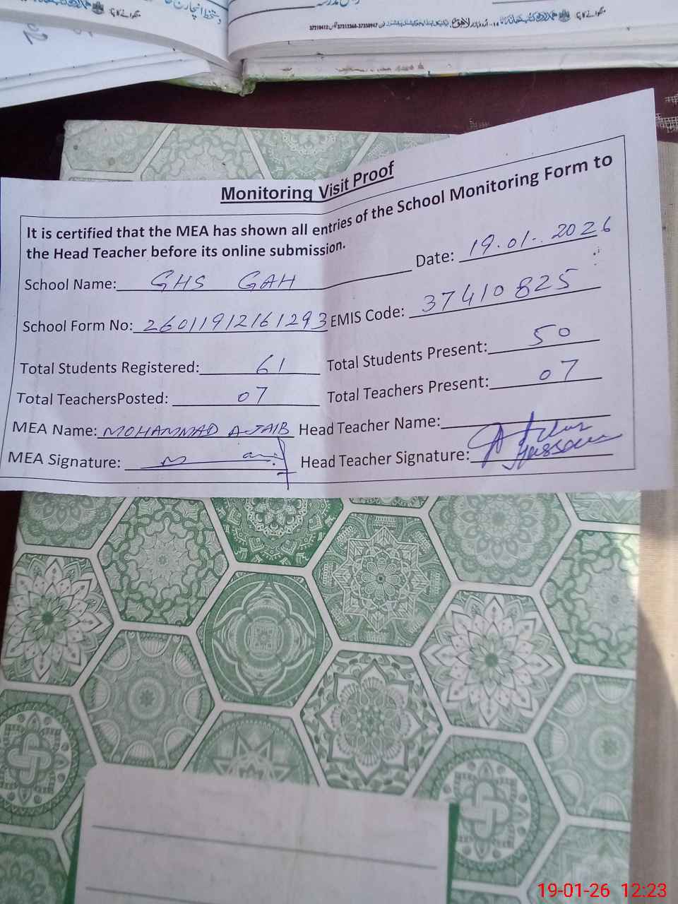 | Attendance Register | Head Teacher | MEA with School | Visit Proof |