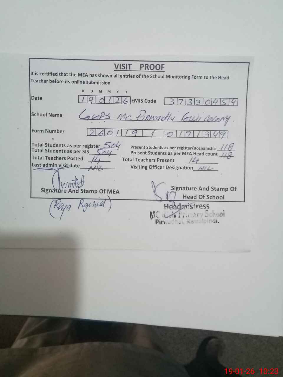 | Name: SH**** AS**** Designation: (School Headmaster's/Headmistress's) PST Phone/Cell Number: 03**** |