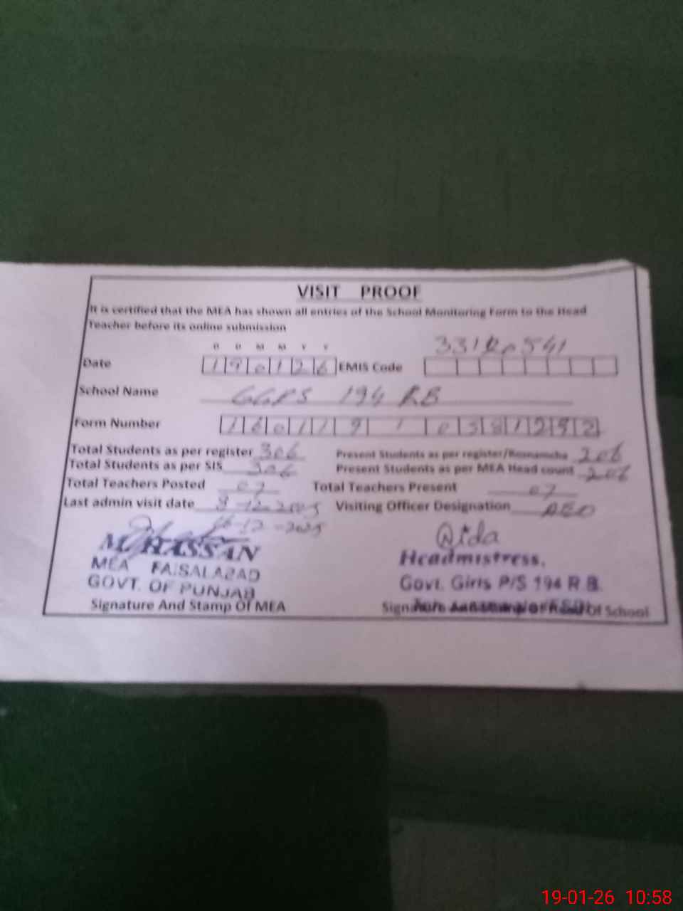 | EMIS Code: 33120541 | Name of School: GGPS CHAK 194 RB I KHURRIANWALA | |||