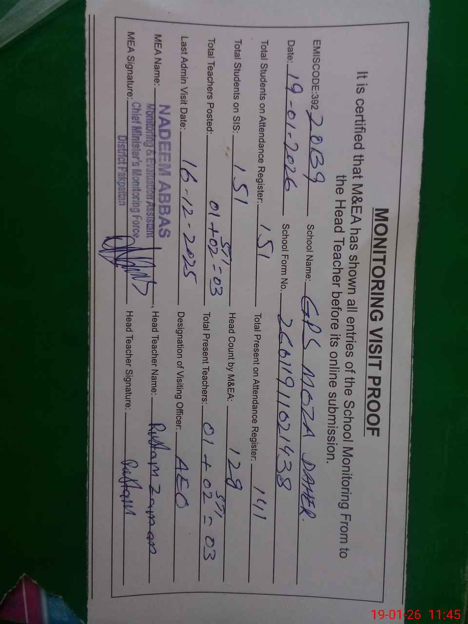 | Certified that this School was Inspected by the Undersigned MEA/DMO Today and the Information Stated Above is as Per Record. | |||||