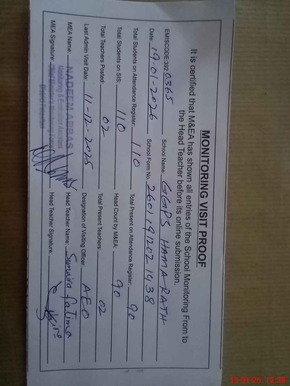 | Attendance Register | Head Teacher | MEA with School | Visit Proof |