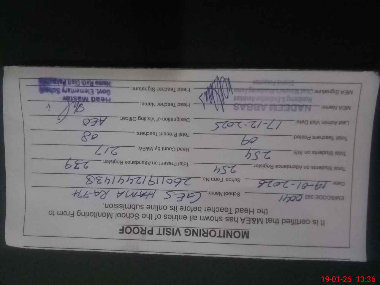 | Certified that this School was Inspected by the Undersigned MEA/DMO Today and the Information Stated Above is as Per Record. | |||||
