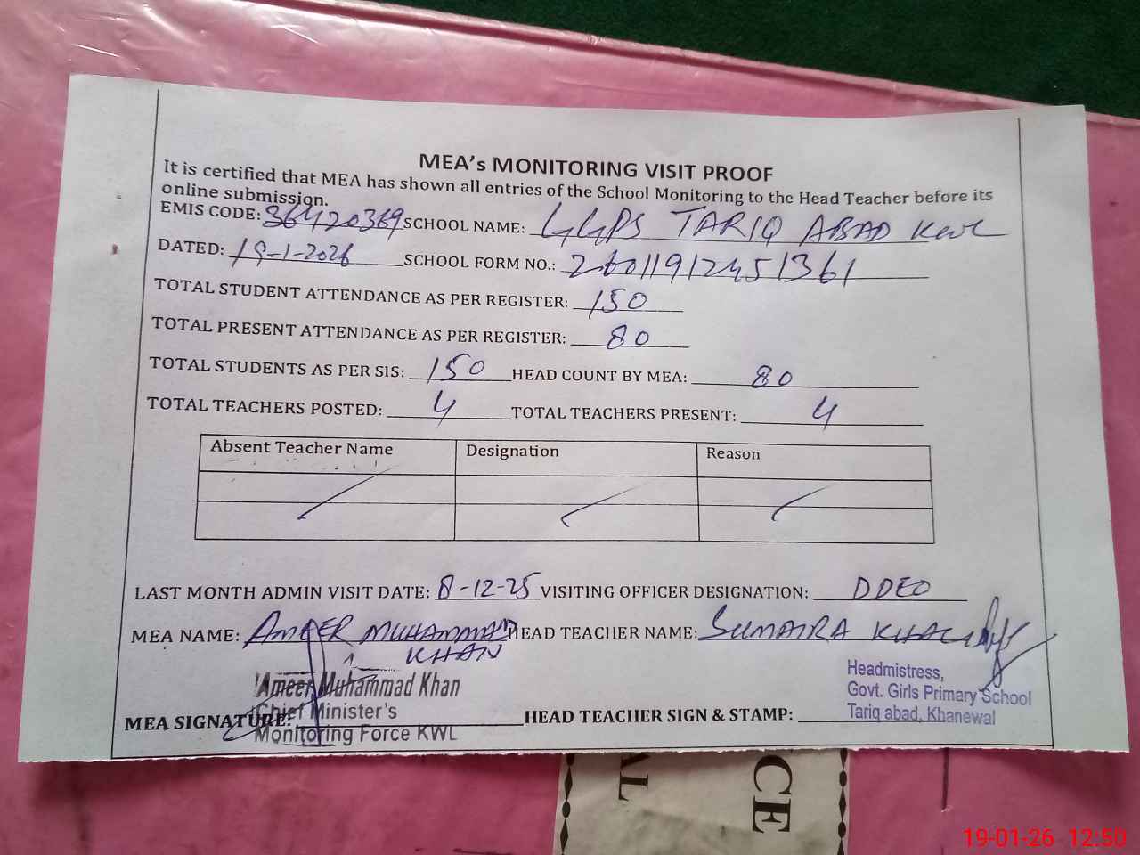 | Attendance Register | Head Teacher | MEA with School | Visit Proof |