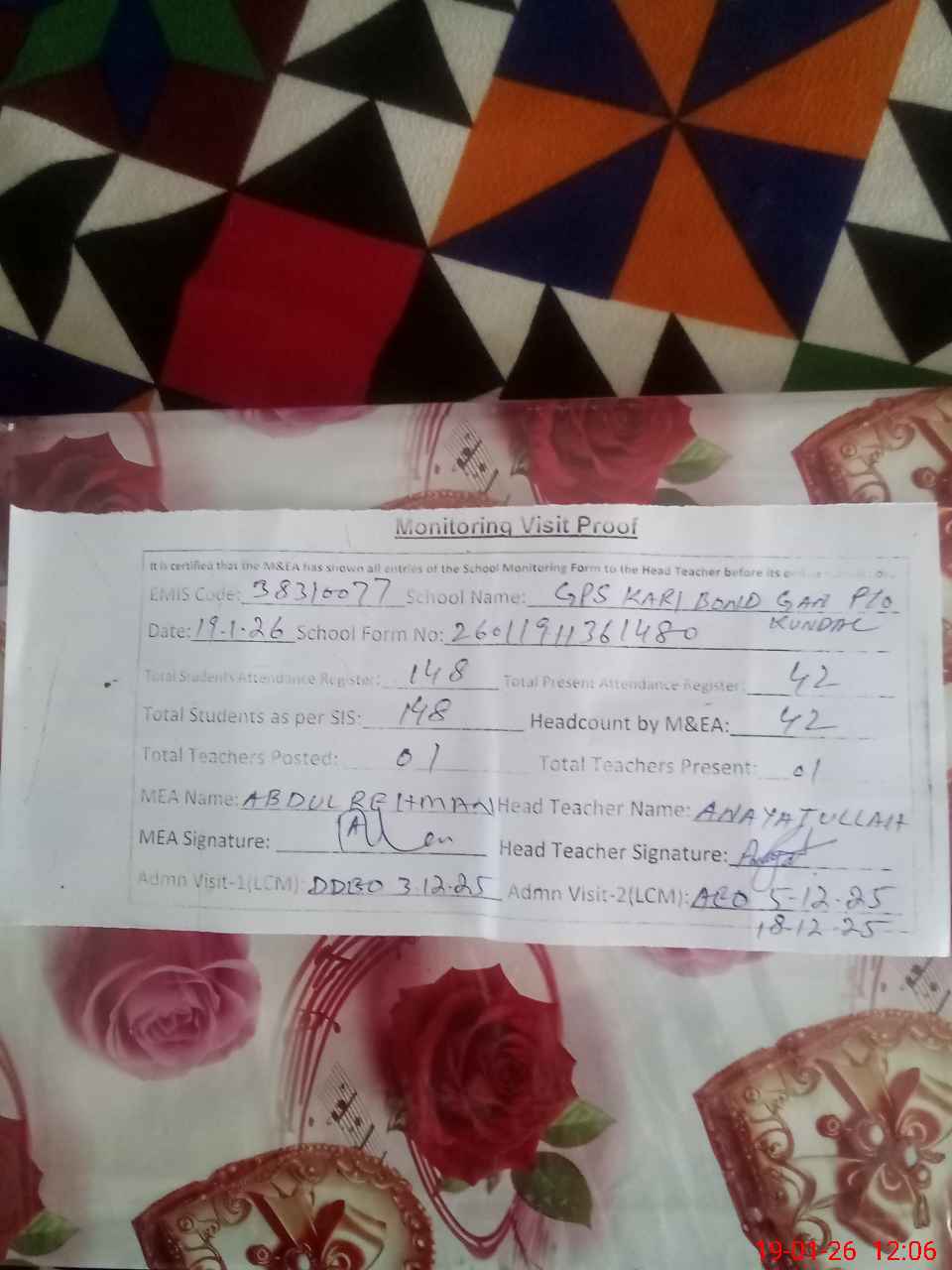 | Attendance Register | Head Teacher | MEA with School | Visit Proof |