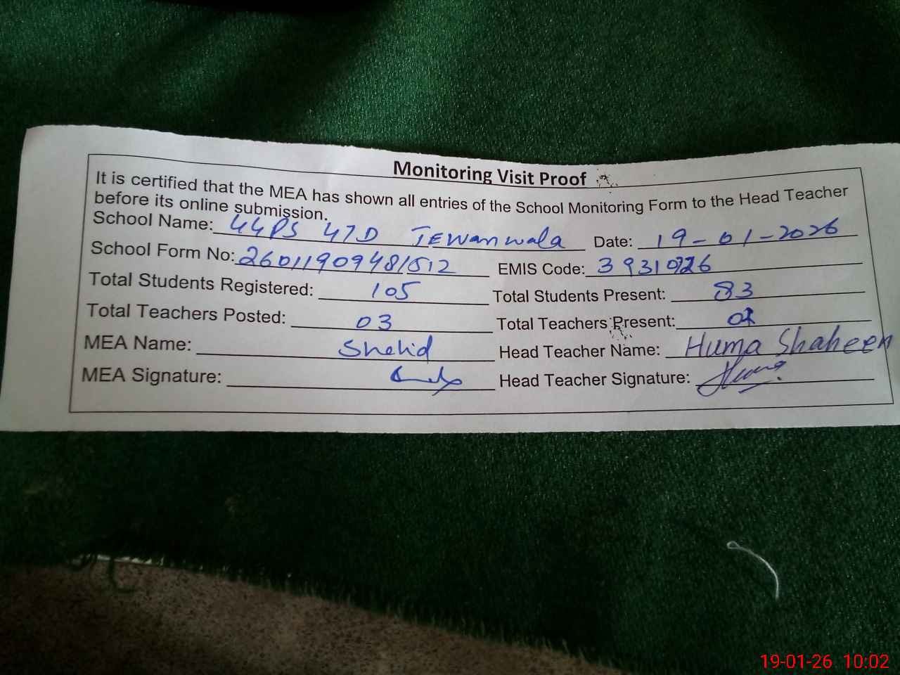 | Monitoring Date: 19-01-2026 | Start Time: 19-01-2026 09:47 AM | End Time: 19-01-2026 10:02 AM | Name of MEA: SH**** YO**** | |