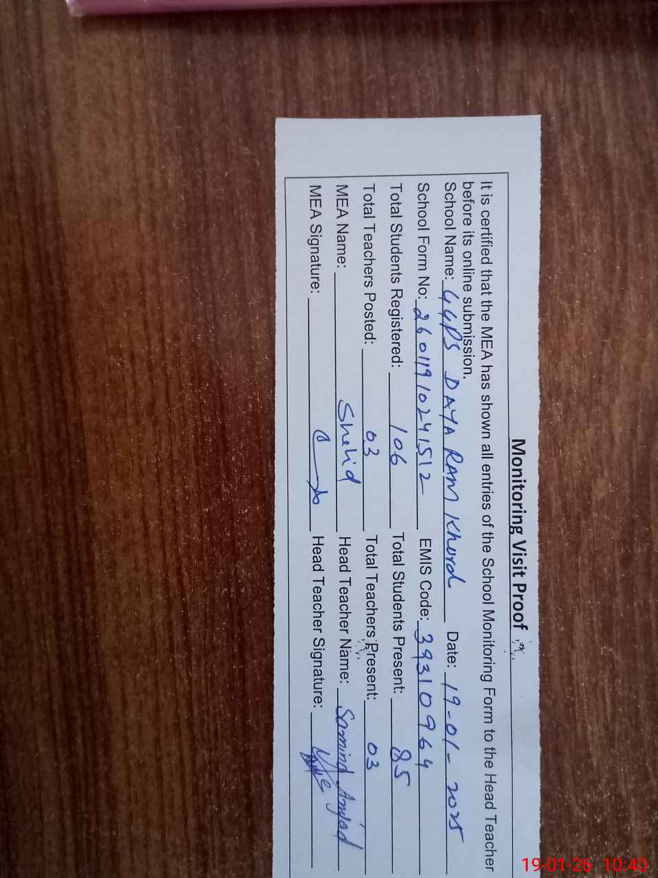 | Certified that this School was Inspected by the Undersigned MEA/DMO Today and the Information Stated Above is as Per Record. | |||||