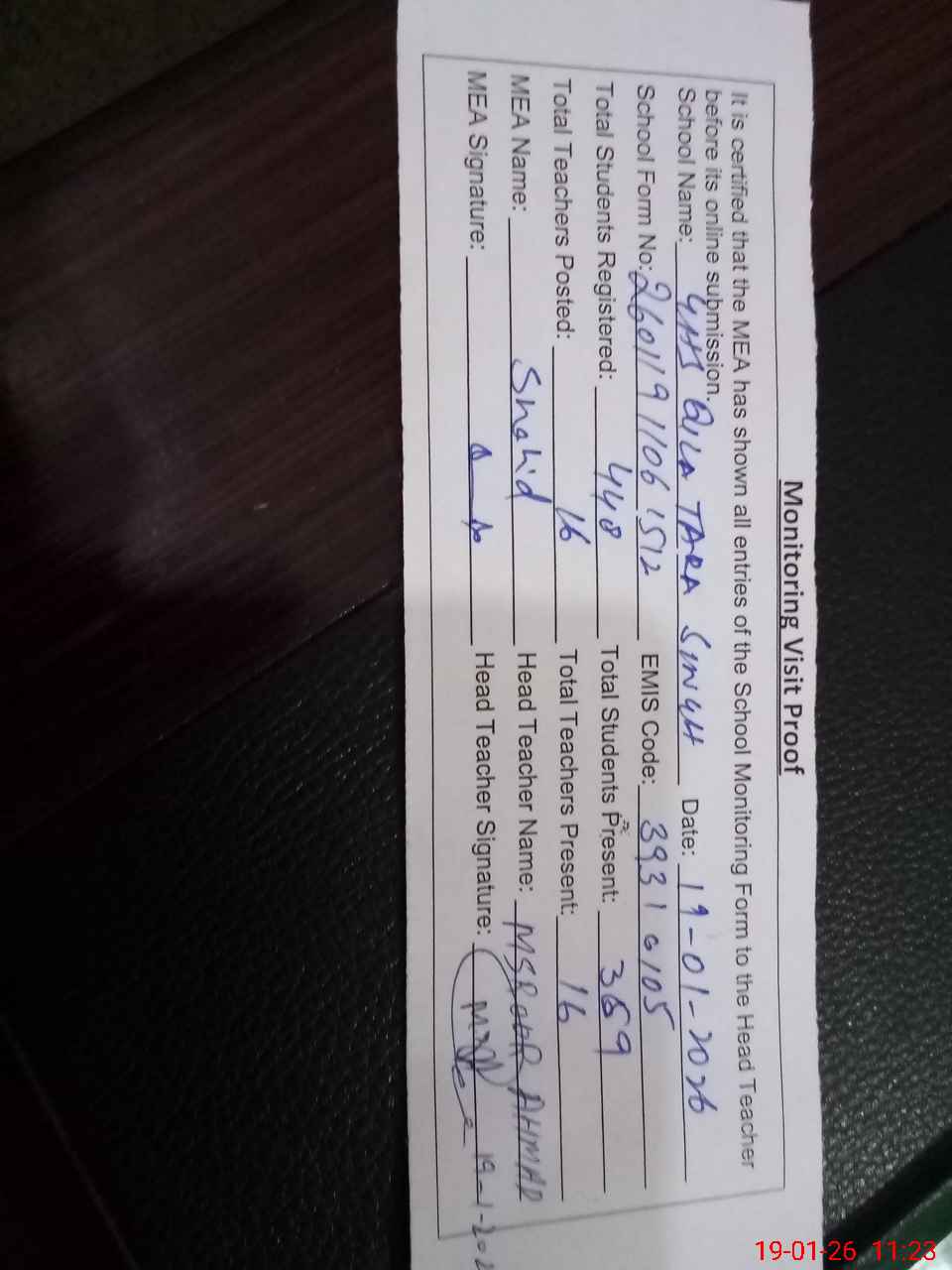 | Certified that this School was Inspected by the Undersigned MEA/DMO Today and the Information Stated Above is as Per Record. | |||||