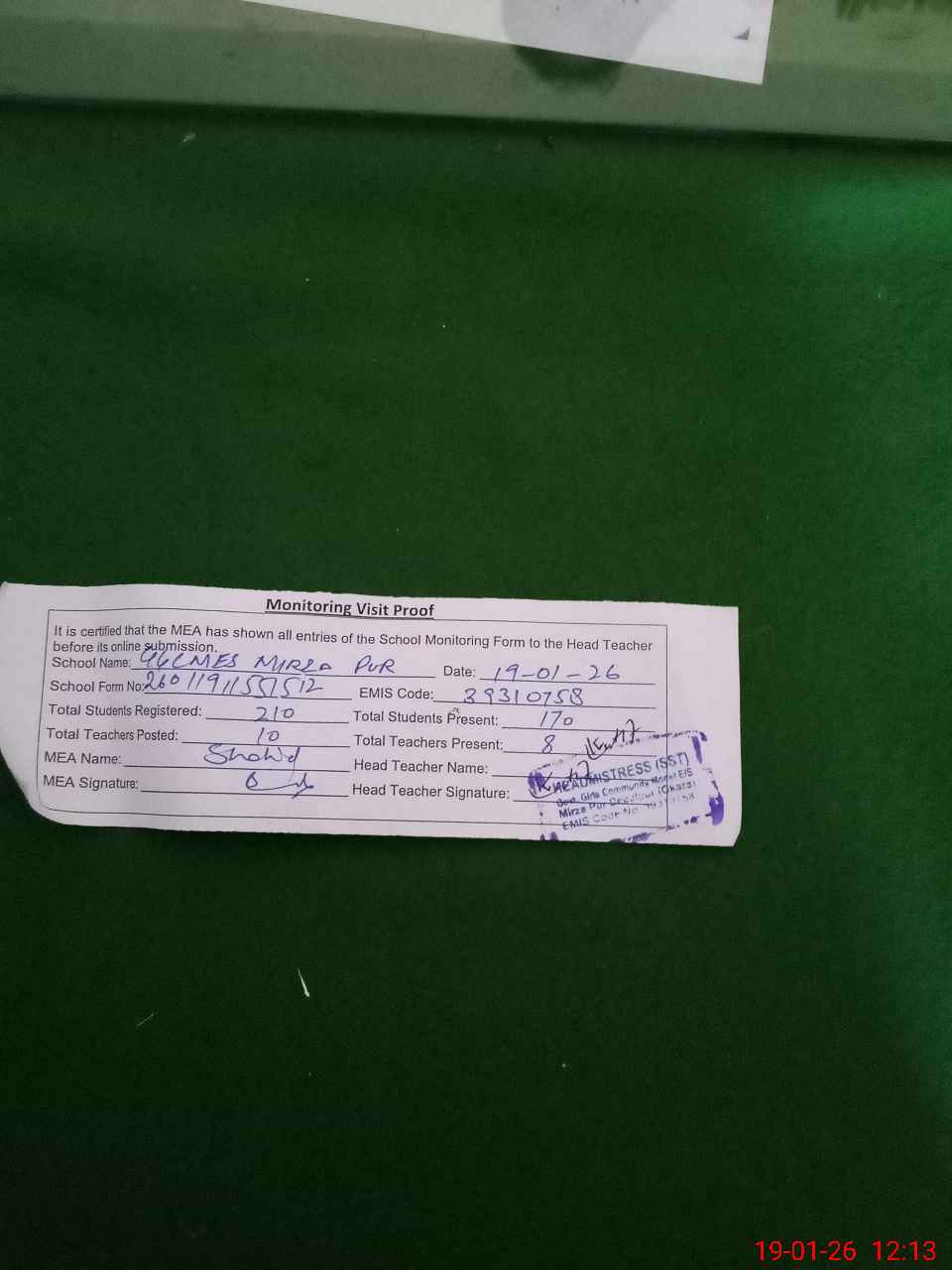 | Attendance Register | Head Teacher | MEA with School | Visit Proof |