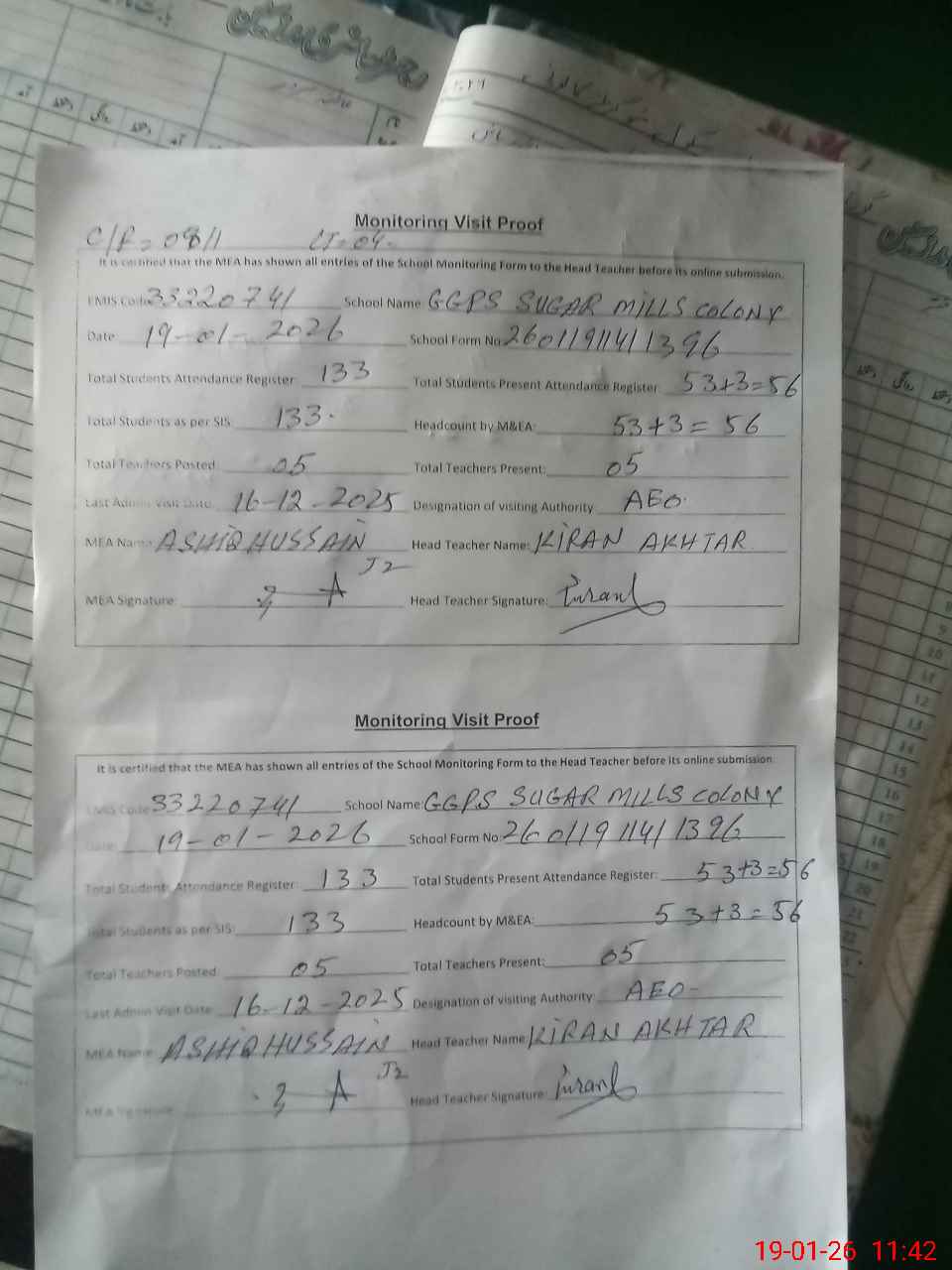 | Attendance Register | Head Teacher | MEA with School | Visit Proof |