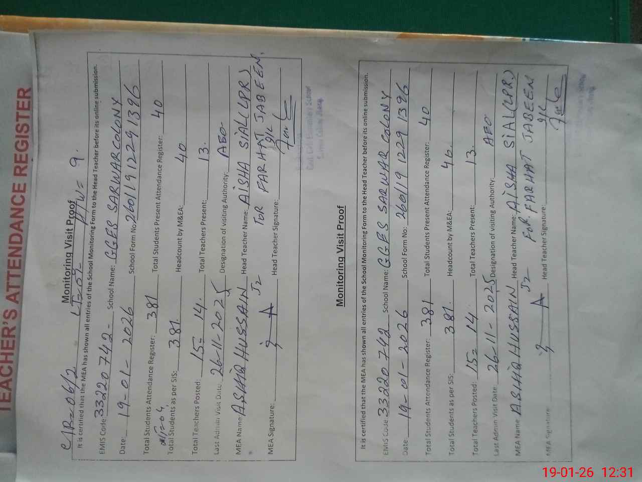 | Attendance Register | Head Teacher | MEA with School | Visit Proof |