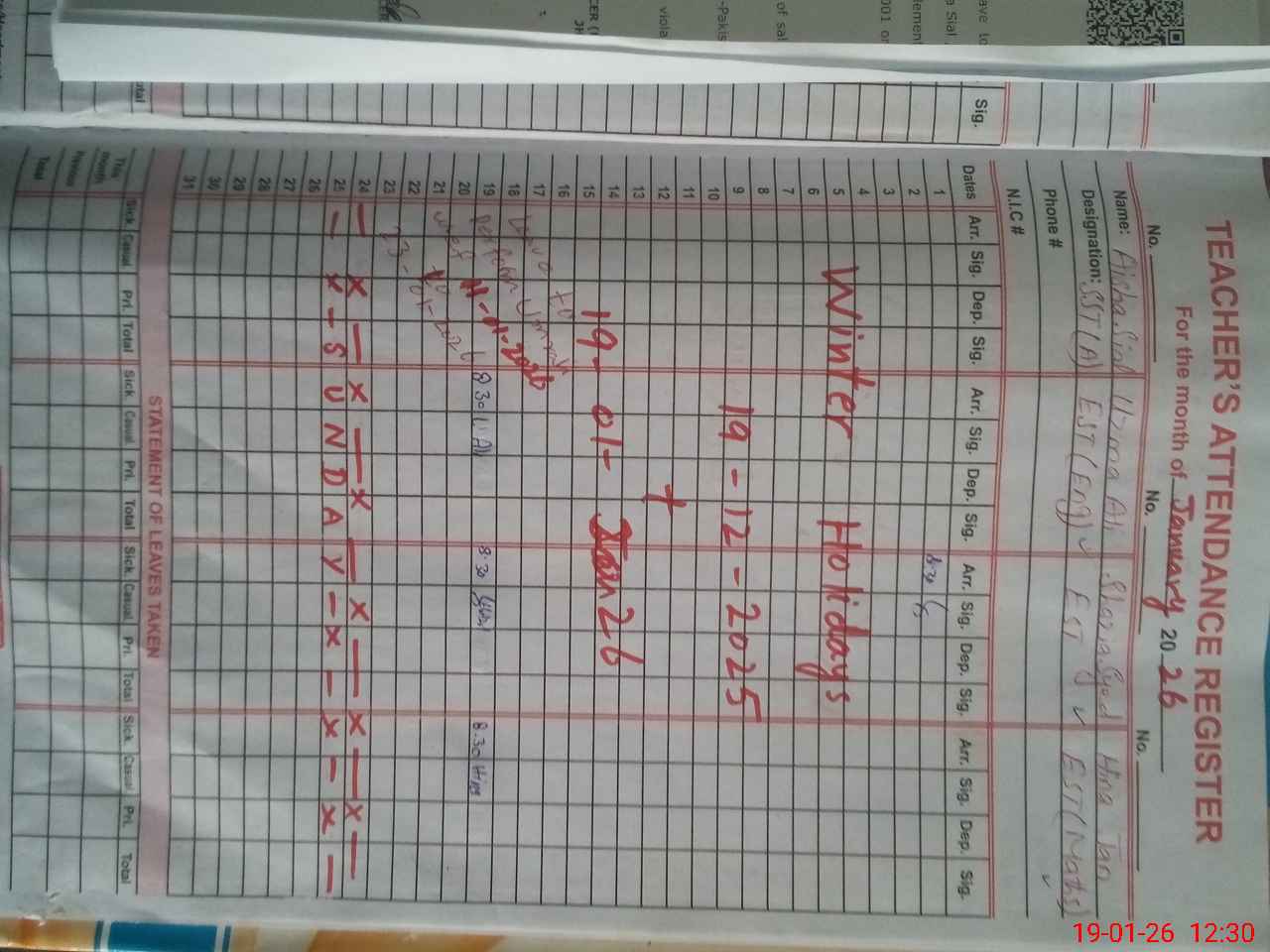 | Name: AY**** SI**** Designation: (School Headmaster's/Headmistress's) S.S.T Phone/Cell Number: 03**** |