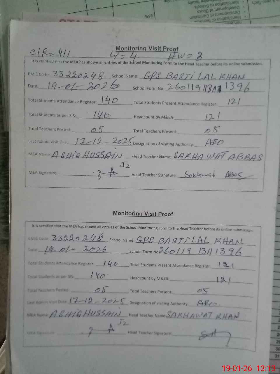 | Attendance Register | Head Teacher | MEA with School | Visit Proof |