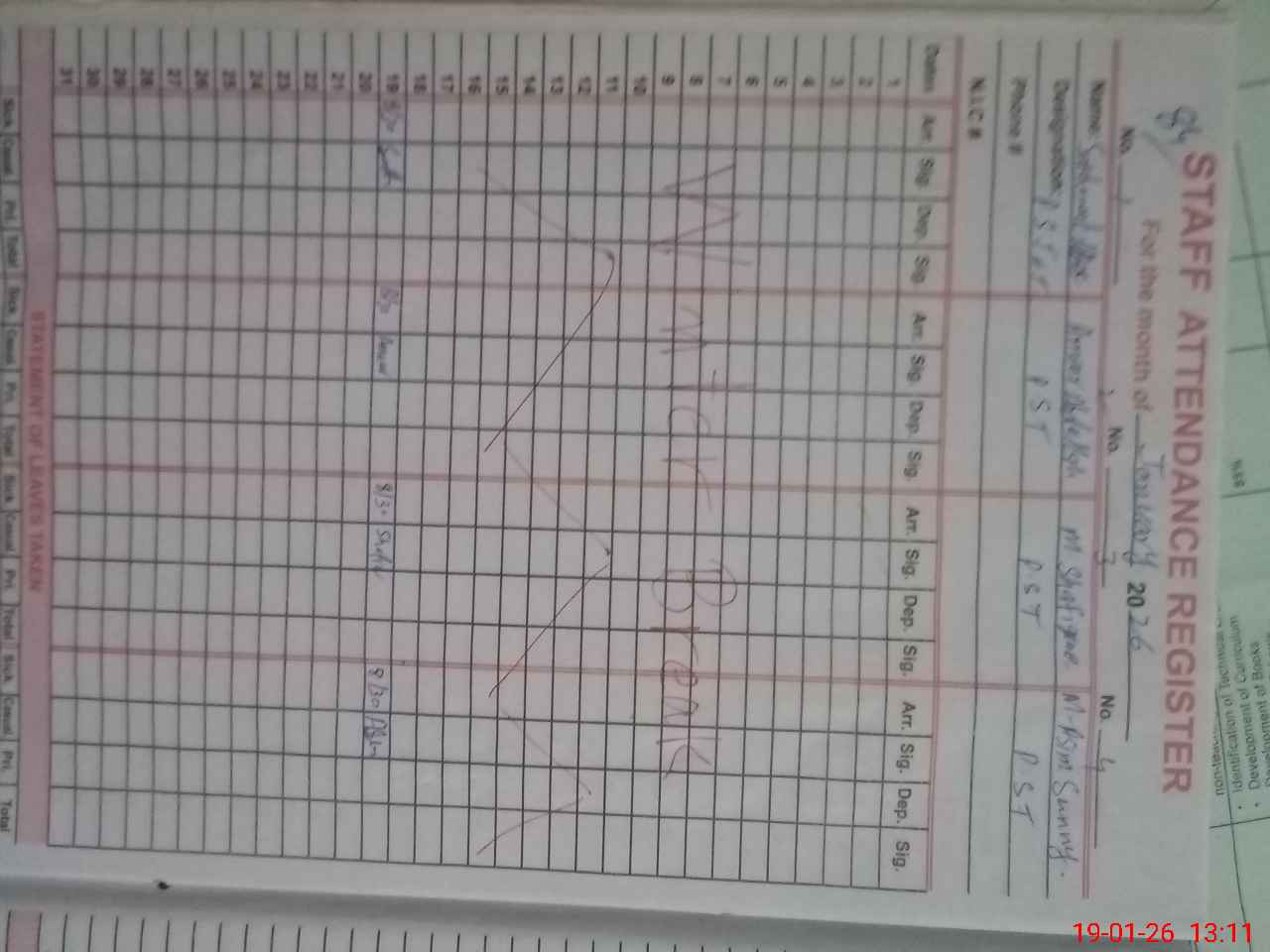 | CNIC | Full Name | Designation | R/C | Absence During Last Calender Month |