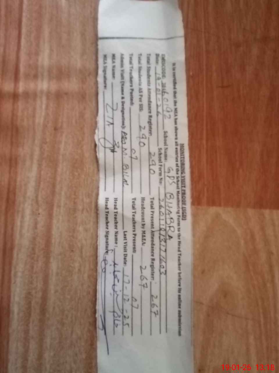 | Attendance Register | Head Teacher | MEA with School | Visit Proof |