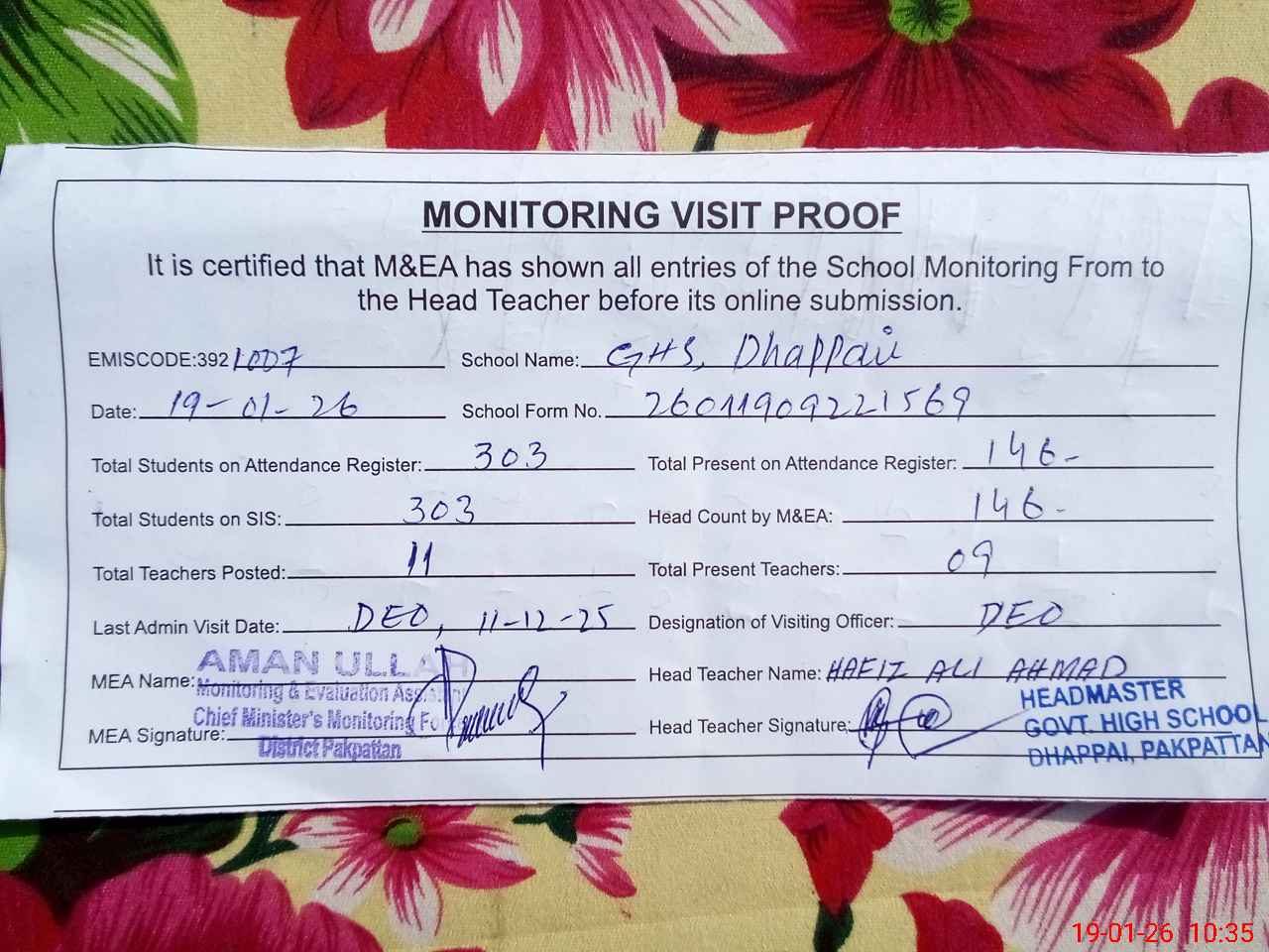 | Certified that this School was Inspected by the Undersigned MEA/DMO Today and the Information Stated Above is as Per Record. | |||||