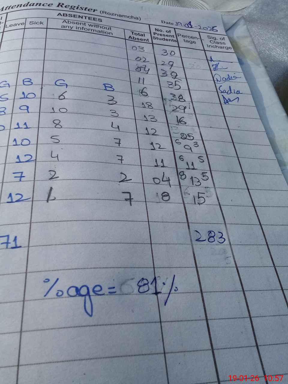 | No. of Students Present - Female | 0 | 6 | 7 | 6 | 15 | 11 | 22 | 38 | 35 | 32 | 29 | 30 | 239 | |||