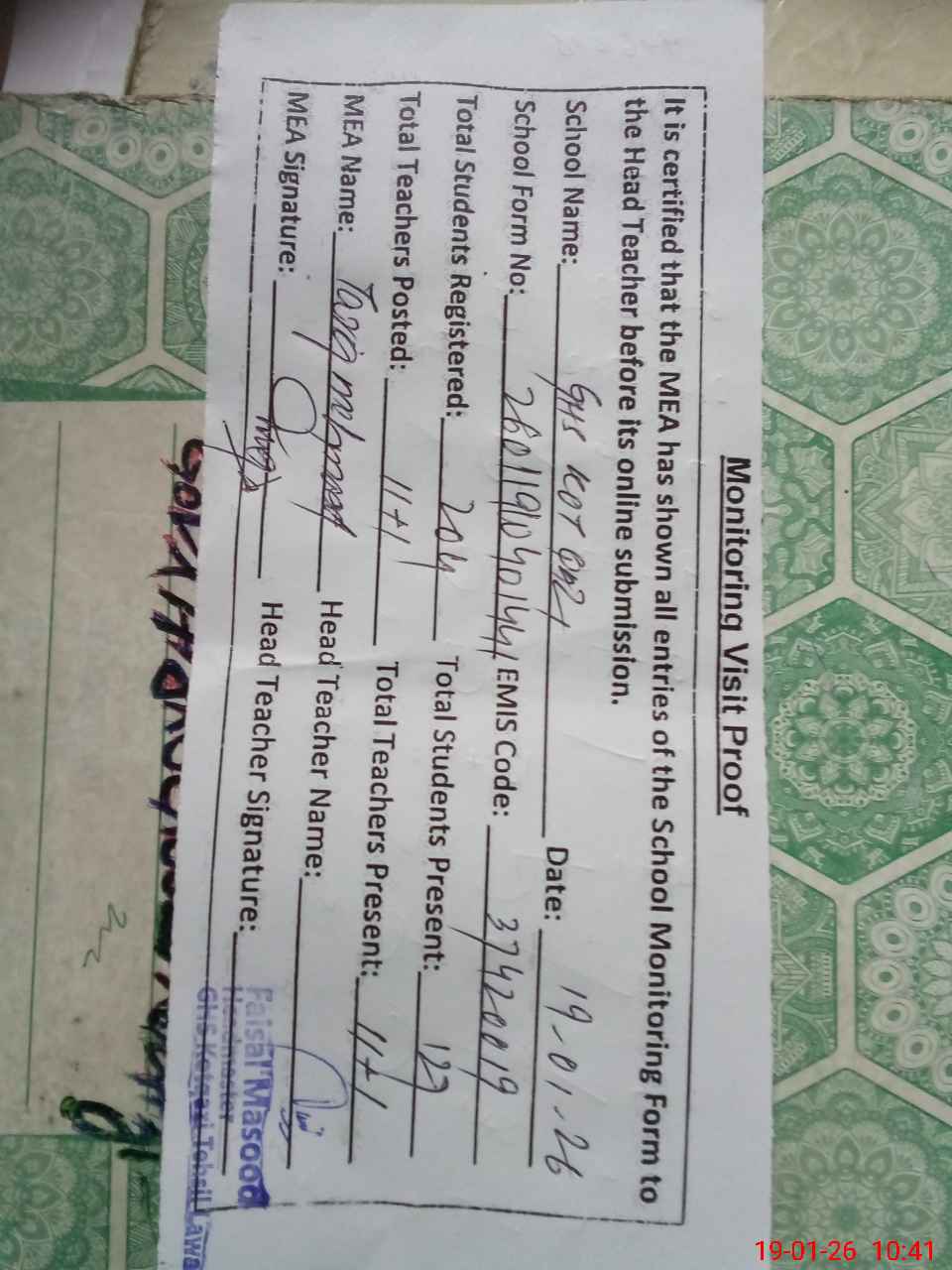 | Certified that this School was Inspected by the Undersigned MEA/DMO Today and the Information Stated Above is as Per Record. | |||||