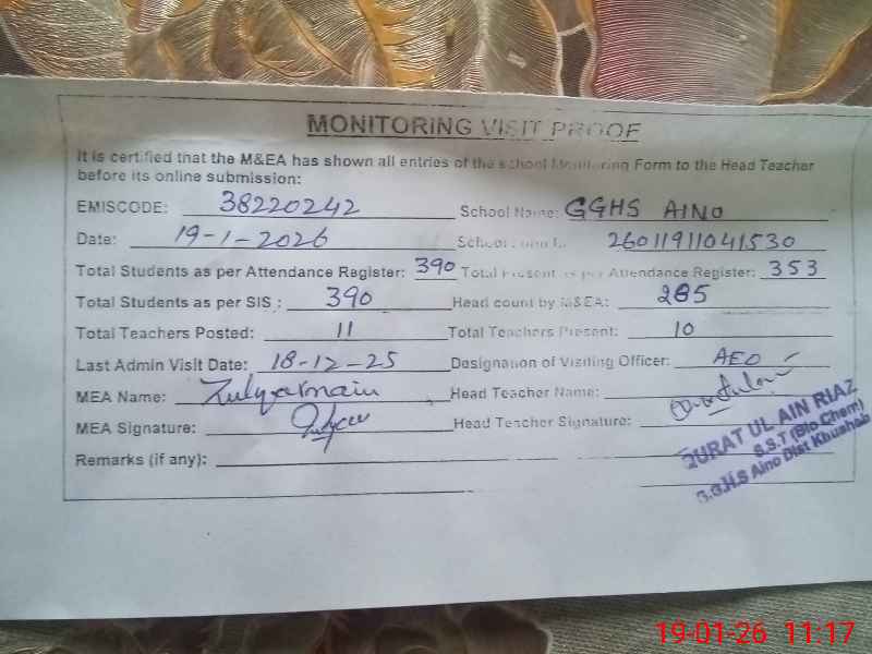 | Certified that this School was Inspected by the Undersigned MEA/DMO Today and the Information Stated Above is as Per Record. | |||||
