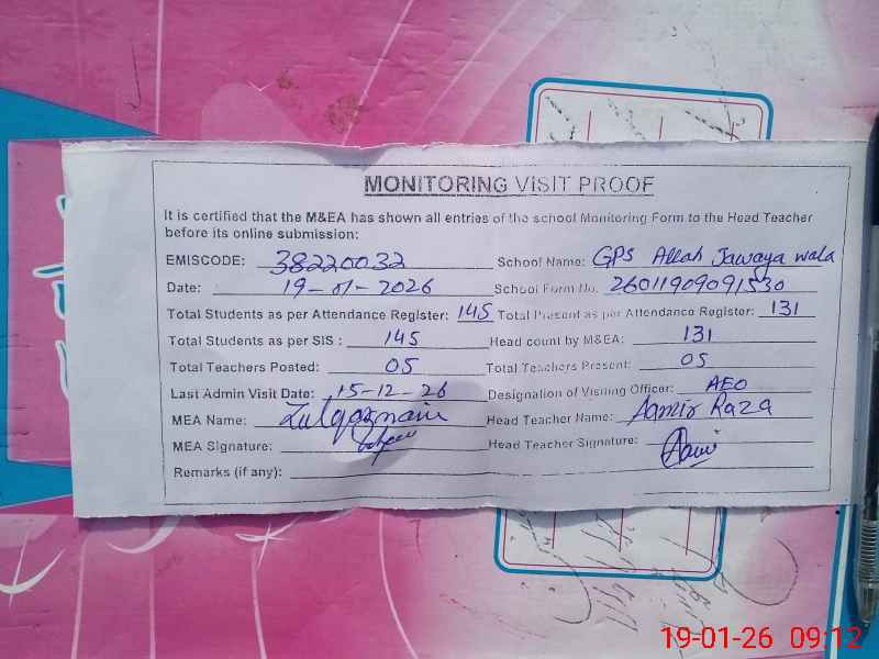 | EMIS Code: 38220032 | Name of School: GPS ALLAH JAWAYA WALA | |||