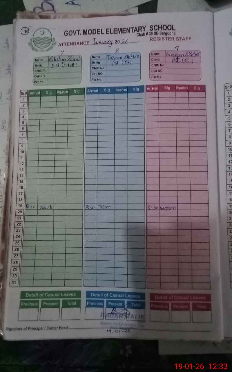 | CNIC | Full Name | Designation | R/C | Absence During Last Calender Month |