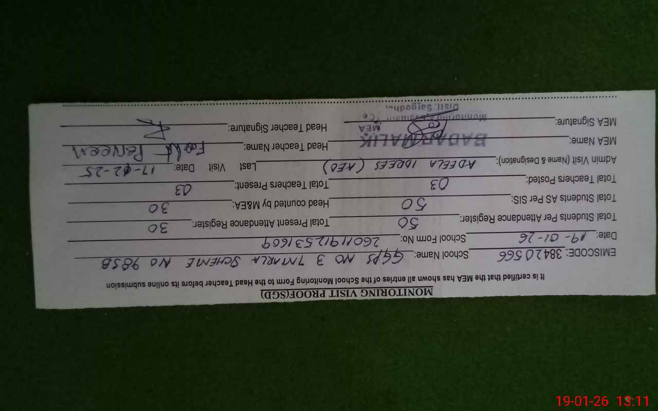 | Certified that this School was Inspected by the Undersigned MEA/DMO Today and the Information Stated Above is as Per Record. | |||||