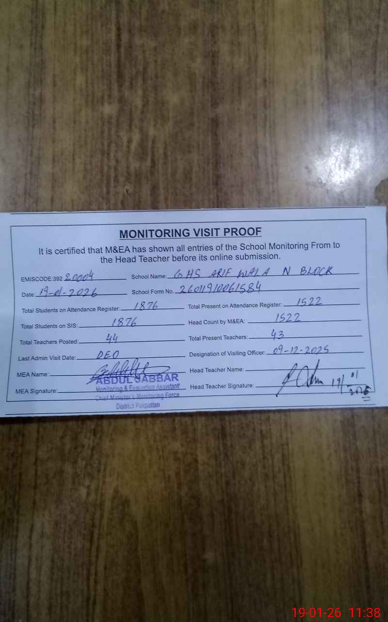 | EMIS Code: 39220004 | Name of School: GHS ARIFWALA N BLOCK | |||