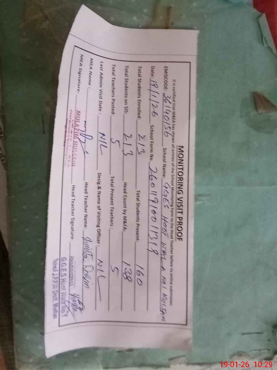 | Certified that this School was Inspected by the Undersigned MEA/DMO Today and the Information Stated Above is as Per Record. | |||||