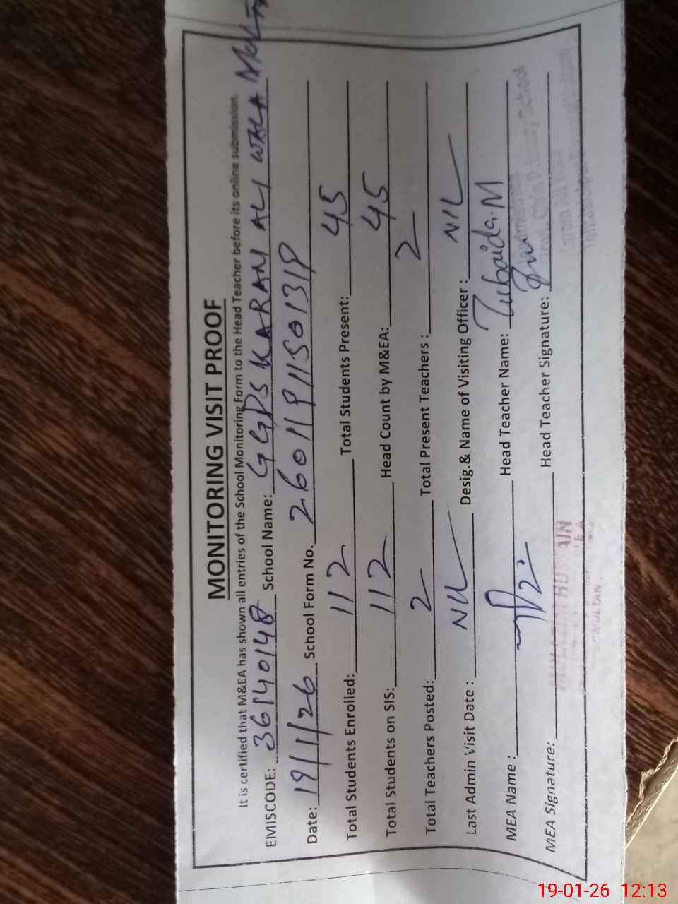 | Attendance Register | Head Teacher | MEA with School | Visit Proof |
