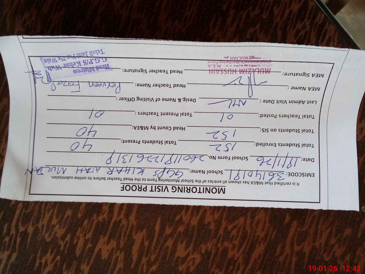 | Certified that this School was Inspected by the Undersigned MEA/DMO Today and the Information Stated Above is as Per Record. | |||||