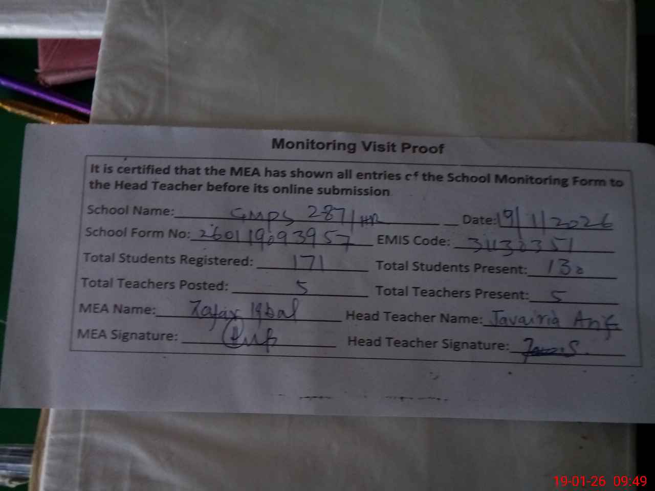 | Attendance Register | Head Teacher | MEA with School | Visit Proof |