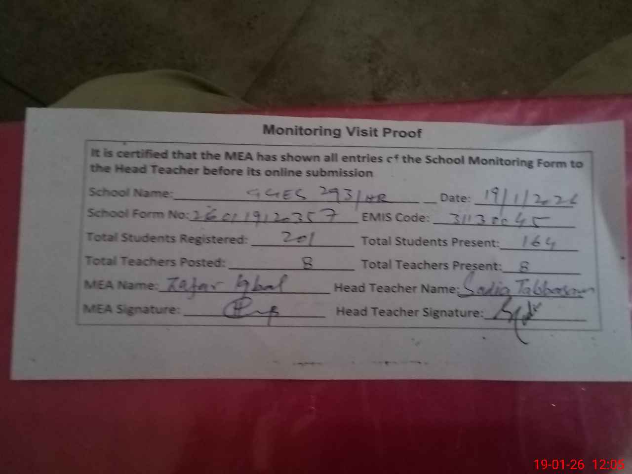 | Attendance Register | Head Teacher | MEA with School | Visit Proof |
