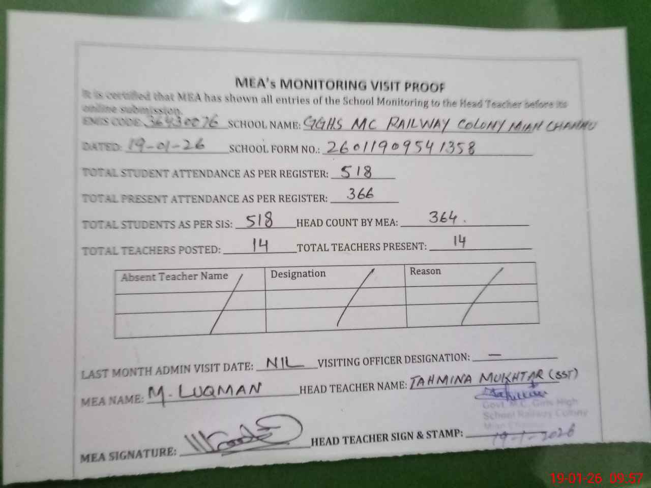 | EMIS Code: 36430076 | Name of School: GGHS MC RAILWAY COLONY, MIAN CHANNU | |||