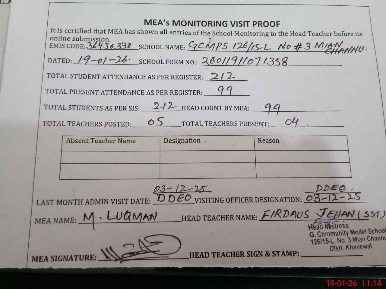 | Attendance Register | Head Teacher | MEA with School | Visit Proof |