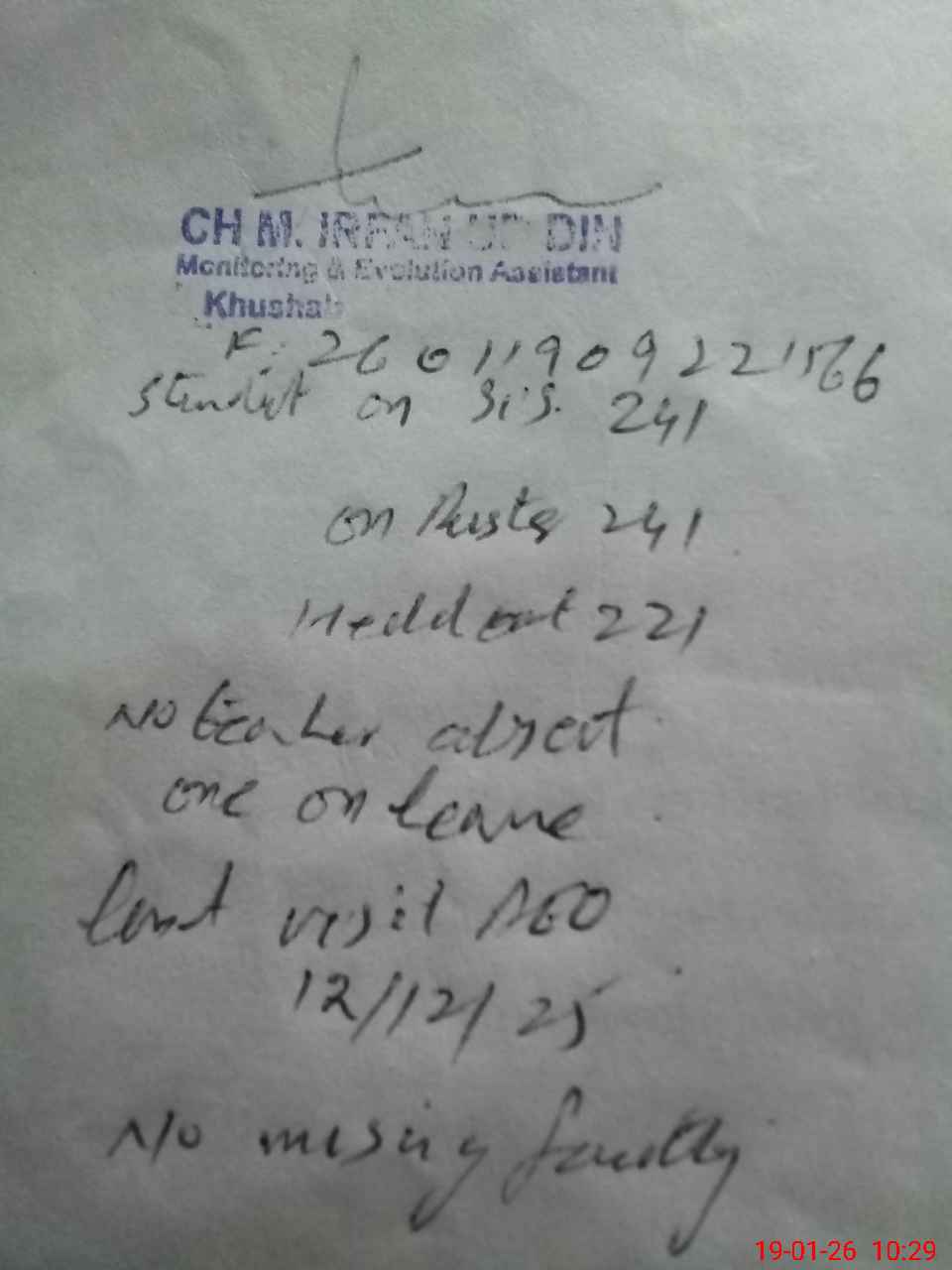 | Remarks (Use Separate Page if Required): GES bharay khail student on sis 241 student on register 241 head count 221 no teacher absent one on leave last visit aeo 12/12/25 | |||||