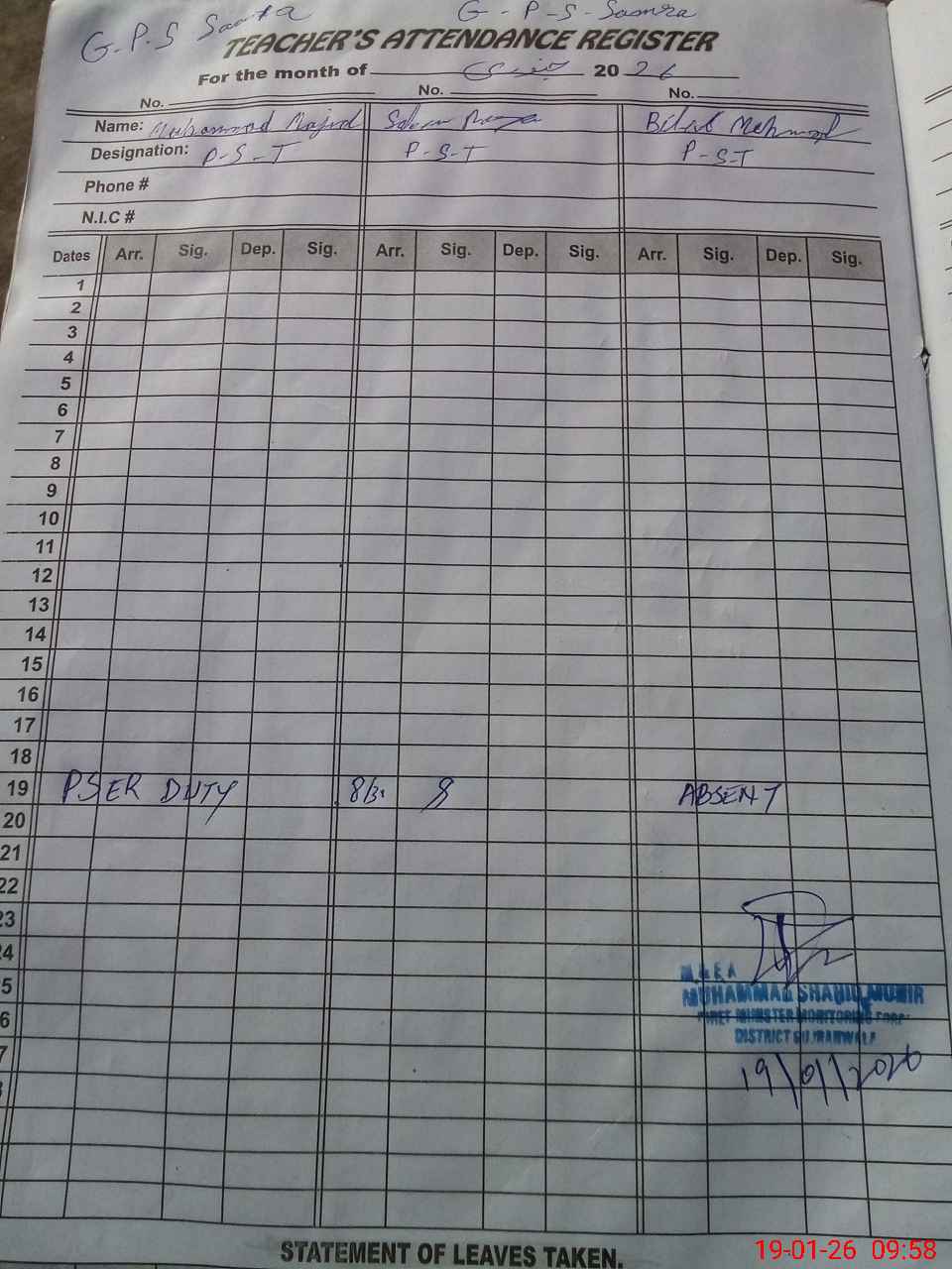 | 34**** | Bi**** Me**** | PST Science/Maths | Regular | 0 | 0 | 0 | 0 | 0 | 0 | 0 | 0 | 0 | Absent (Un-Authorized) |