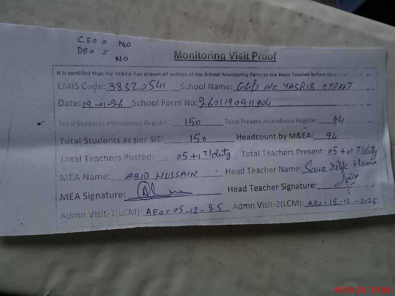 | Attendance Register | Head Teacher | MEA with School | Visit Proof |