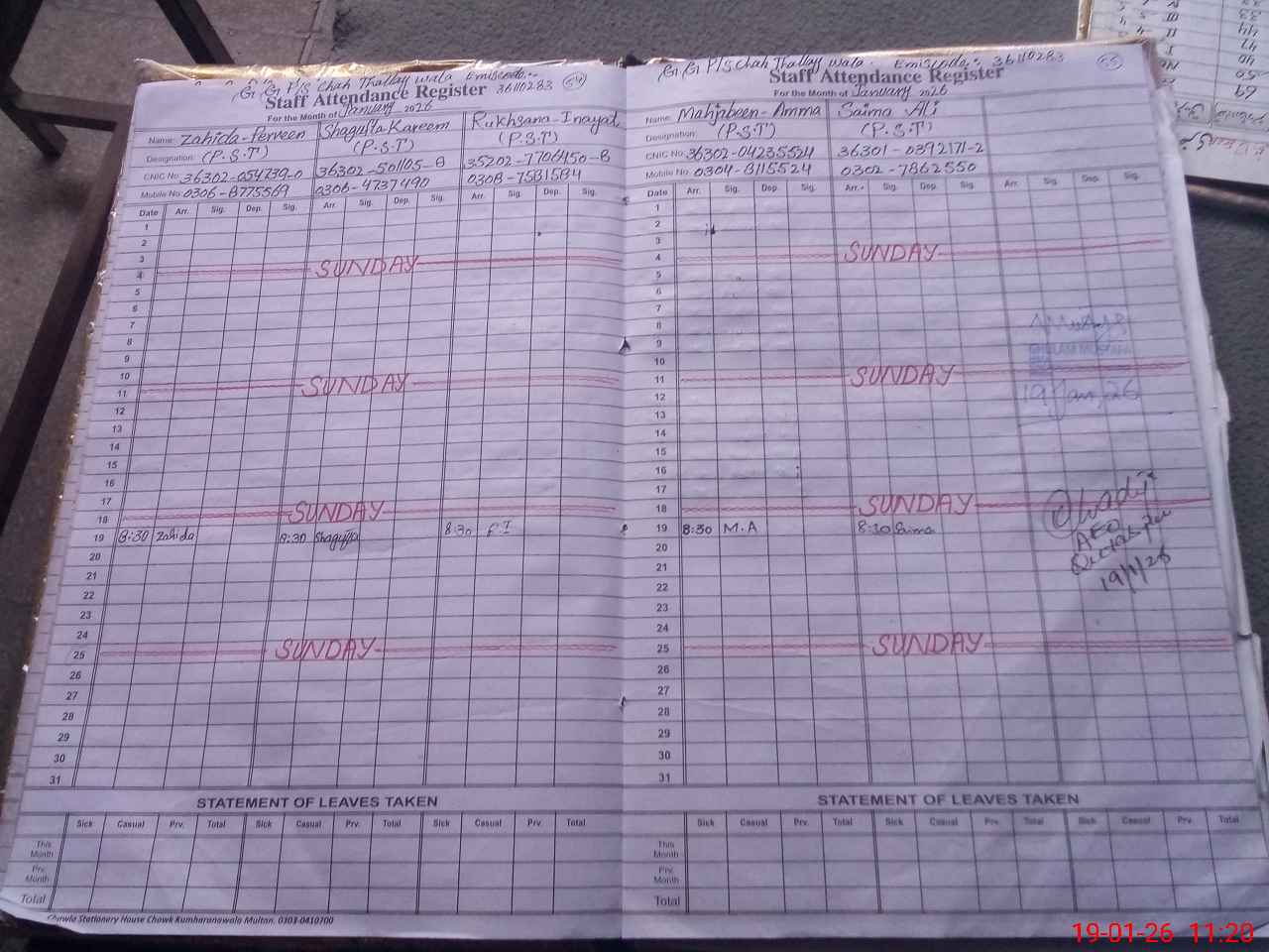 | CNIC | Full Name | Designation | R/C | Absence During Last Calender Month |