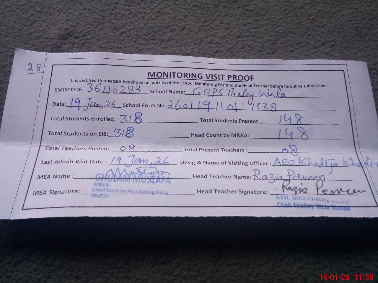 | Attendance Register | Head Teacher | MEA with School | Visit Proof |