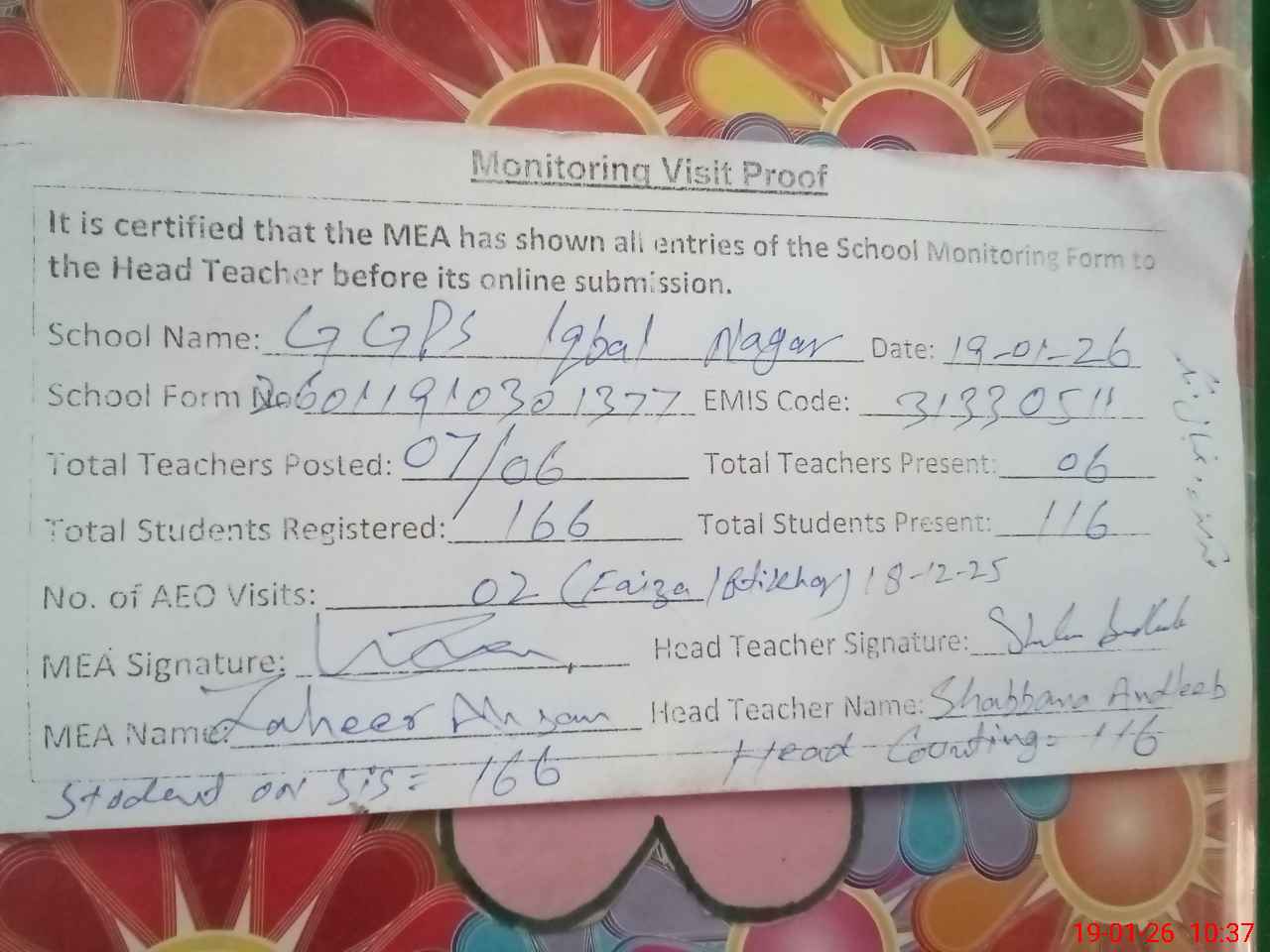 | EMIS Code: 31330511 | Name of School: GGPS IQBAL NAGAR | |||