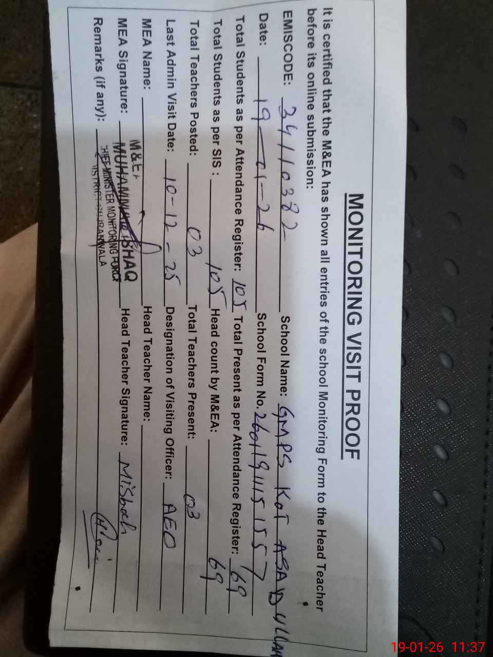 | EMIS Code: 34110382 | Name of School: GMPS KOT ASAD ULLAH | |||