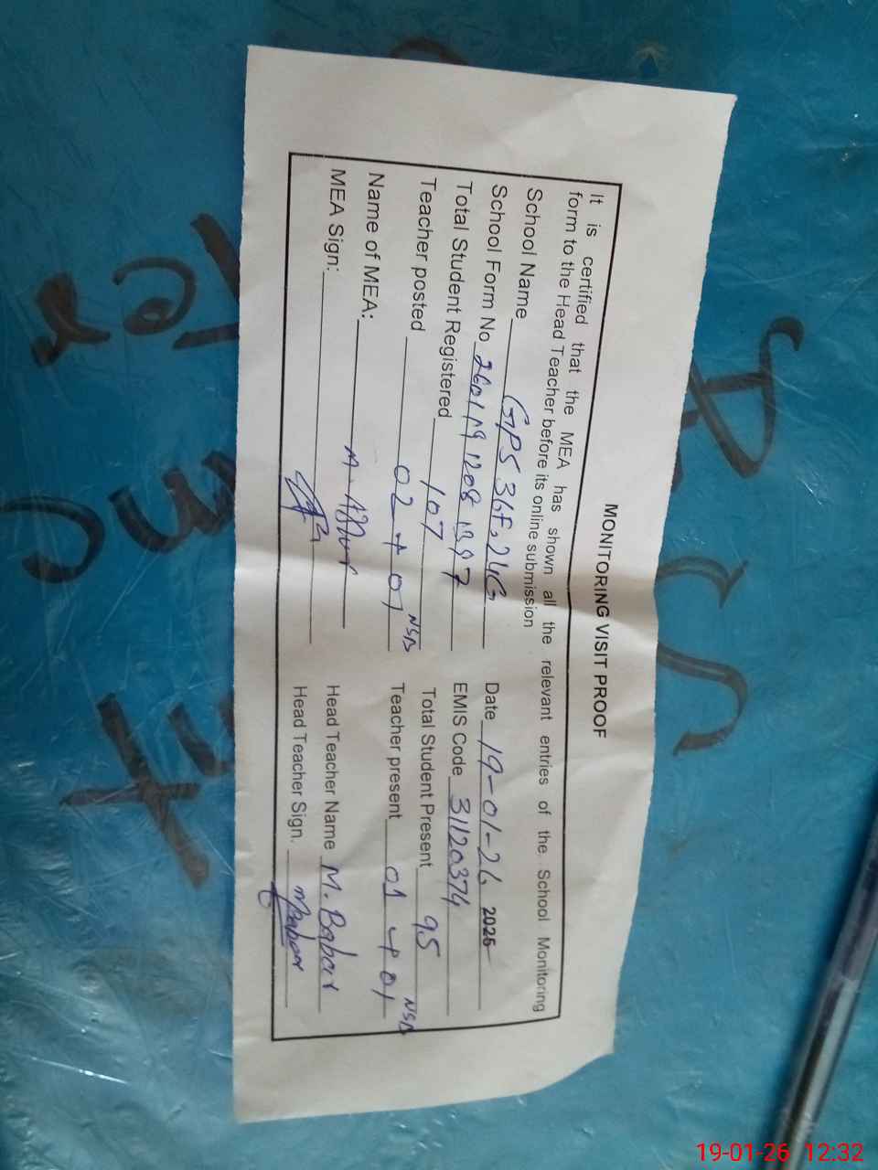 | Attendance Register | Head Teacher | MEA with School | Visit Proof |
