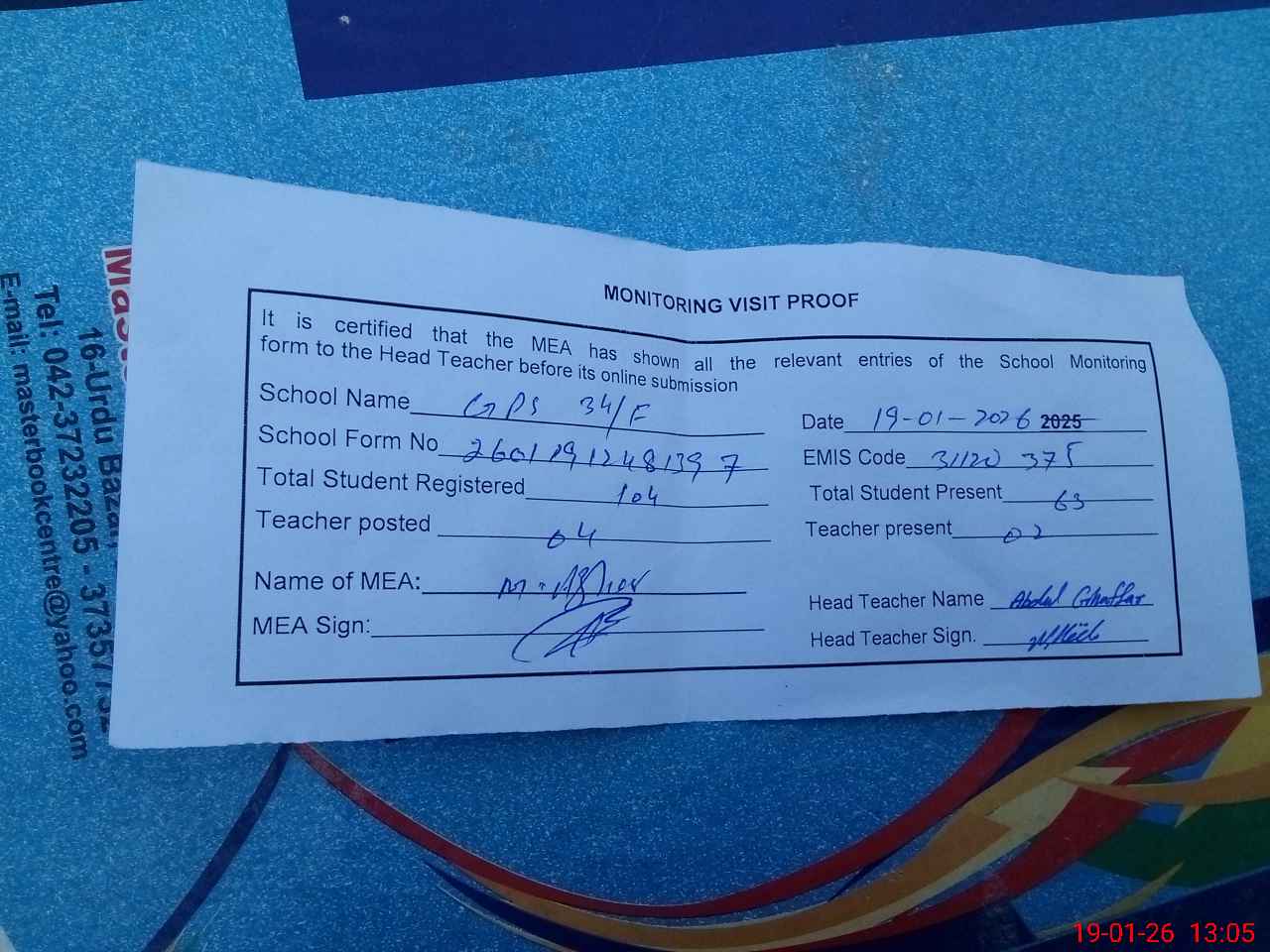 | EMIS Code: 31120375 | Name of School: GPS CHAK NO 34/F | |||