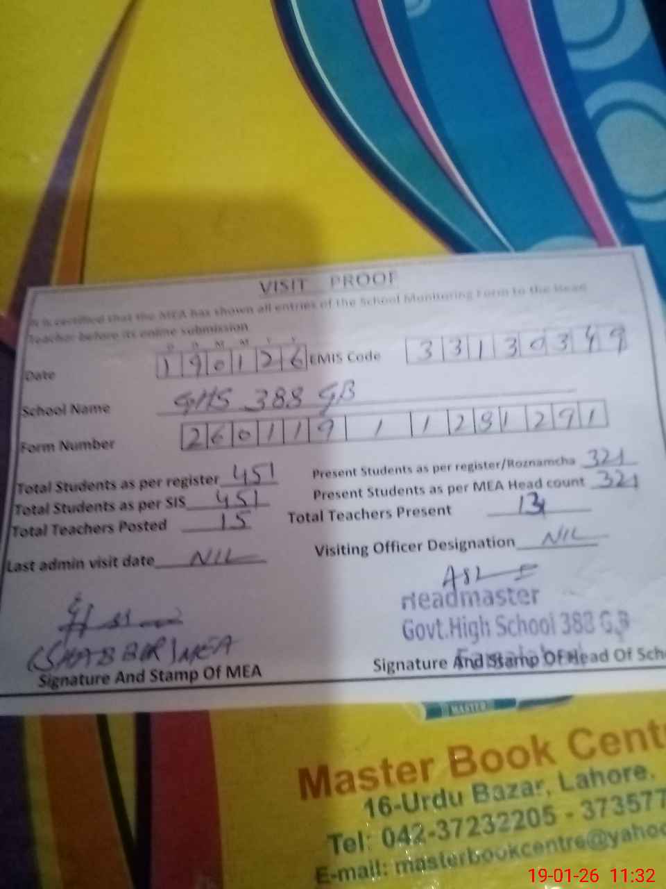 | Attendance Register | Head Teacher | MEA with School | Visit Proof |