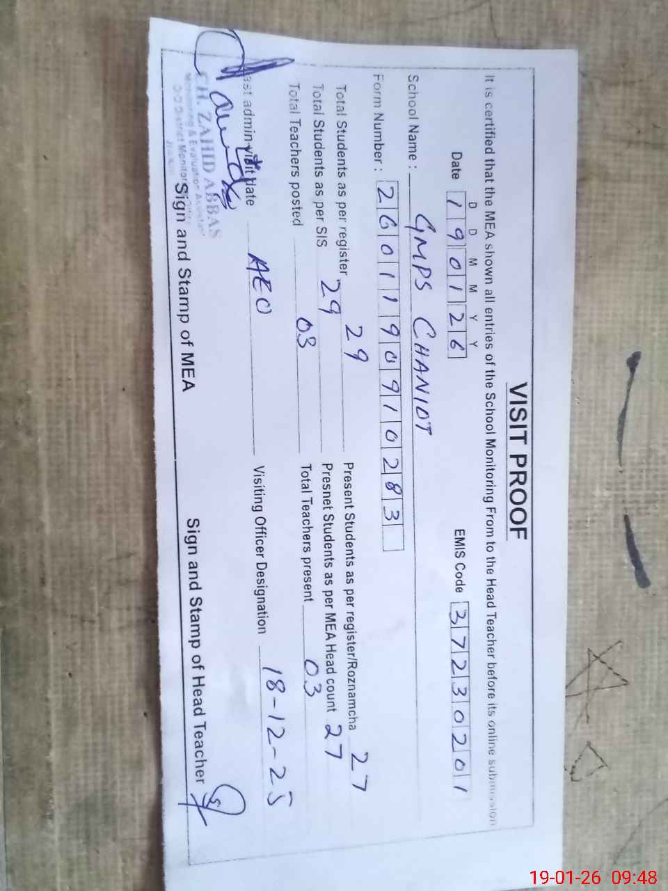 | Attendance Register | Head Teacher | MEA with School | Visit Proof |