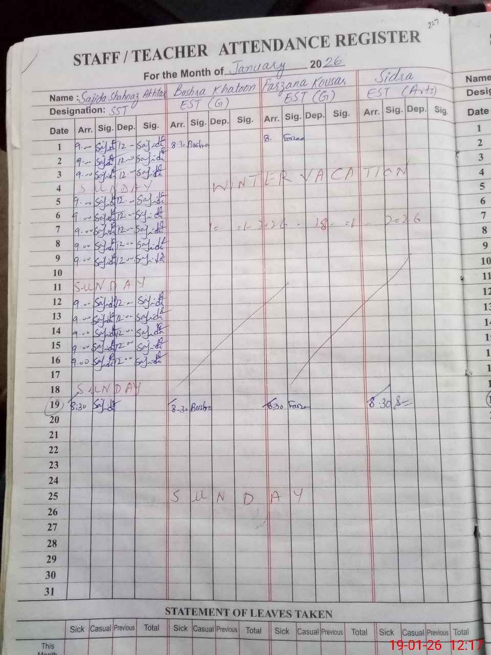 | Monitoring Date: 19-01-2026 | Start Time: 19-01-2026 11:30 AM | End Time: 19-01-2026 12:25 PM | Name of MEA: Za**** Ab**** | |