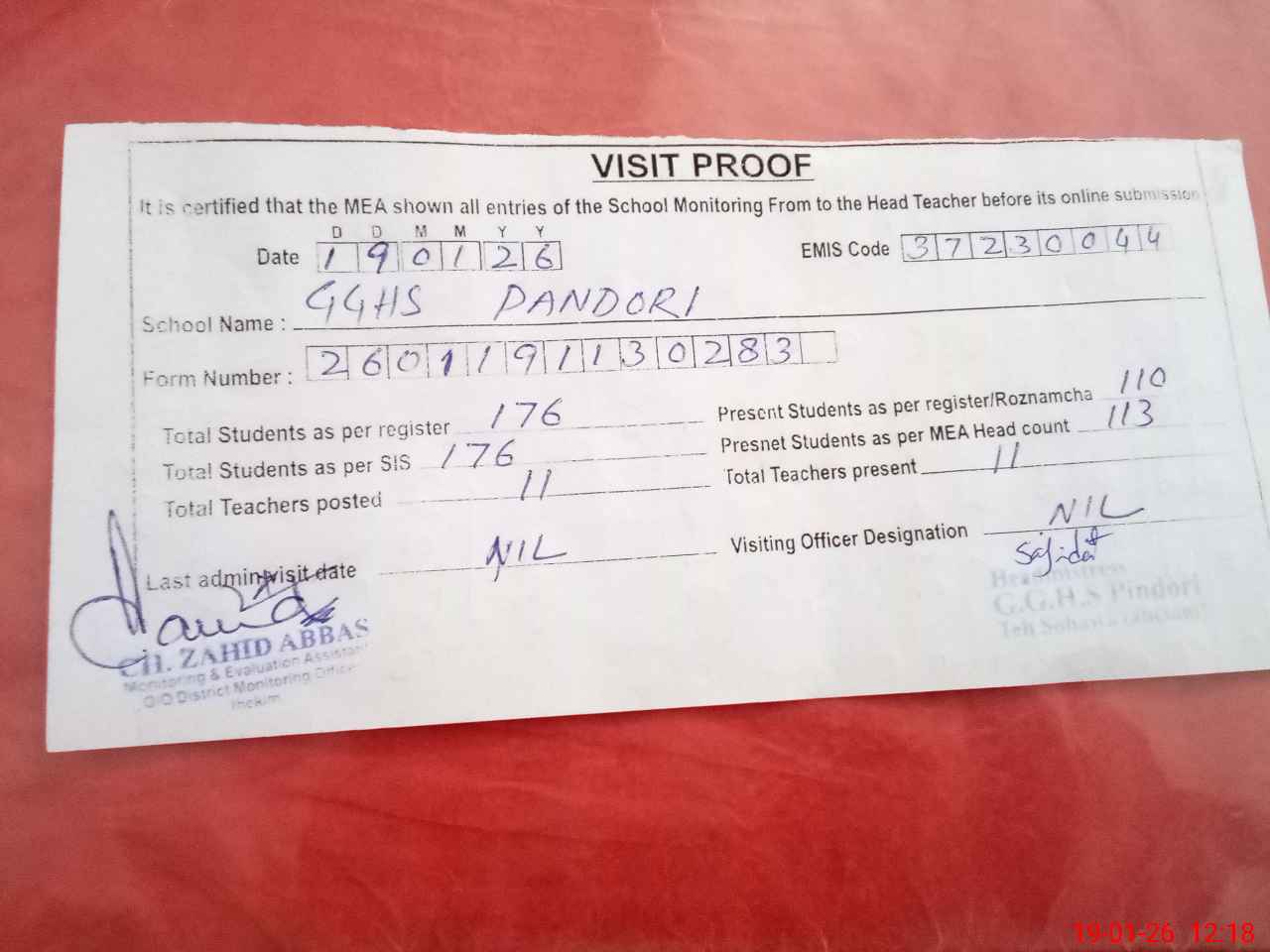 | Attendance Register | Head Teacher | MEA with School | Visit Proof |
