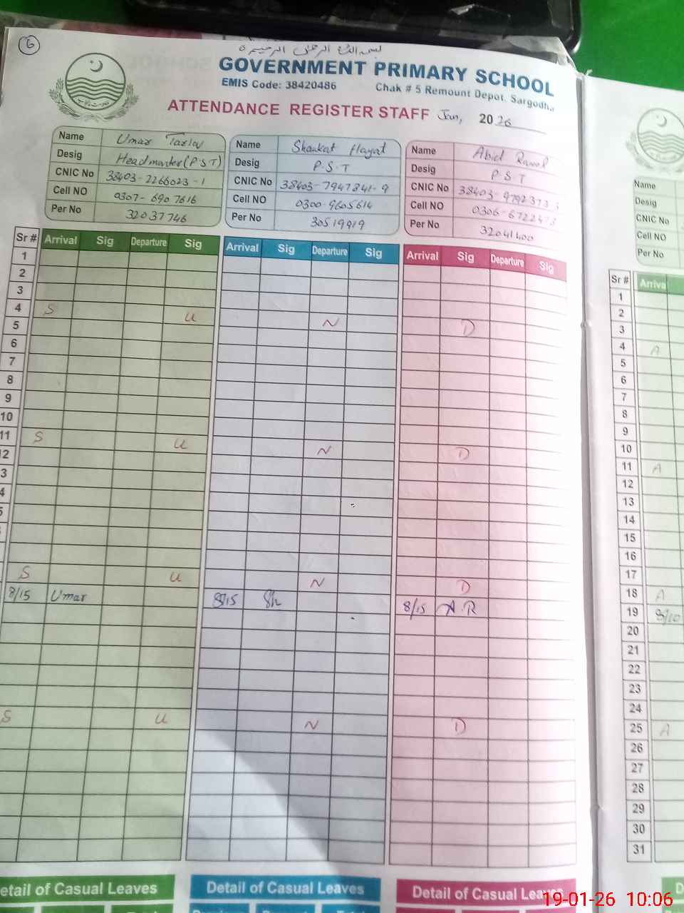 | CNIC | Full Name | Designation | R/C | Absence during last cal. month |