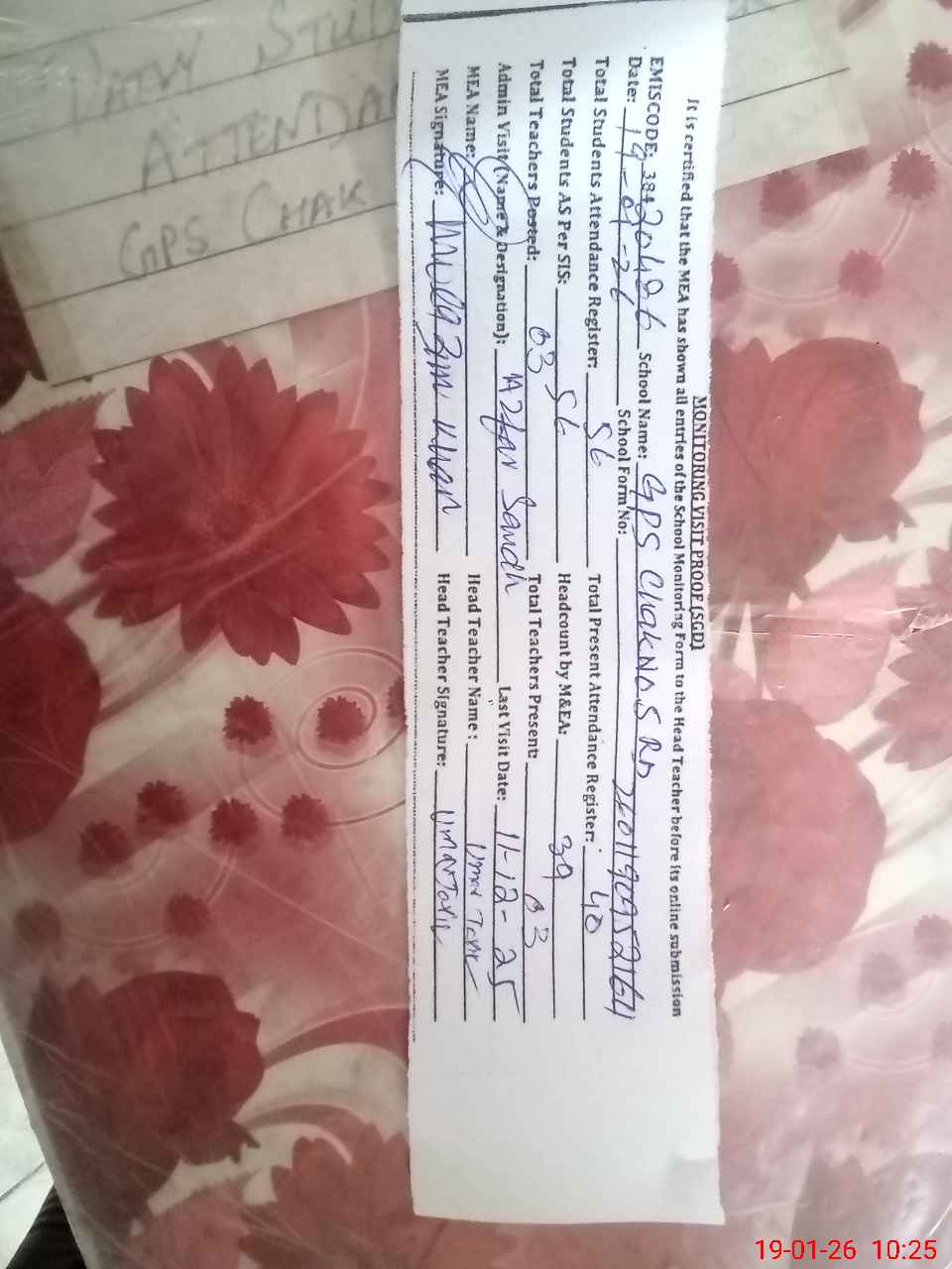 | Attendance Register | Head Teacher | MEA with School | Visit Proof |