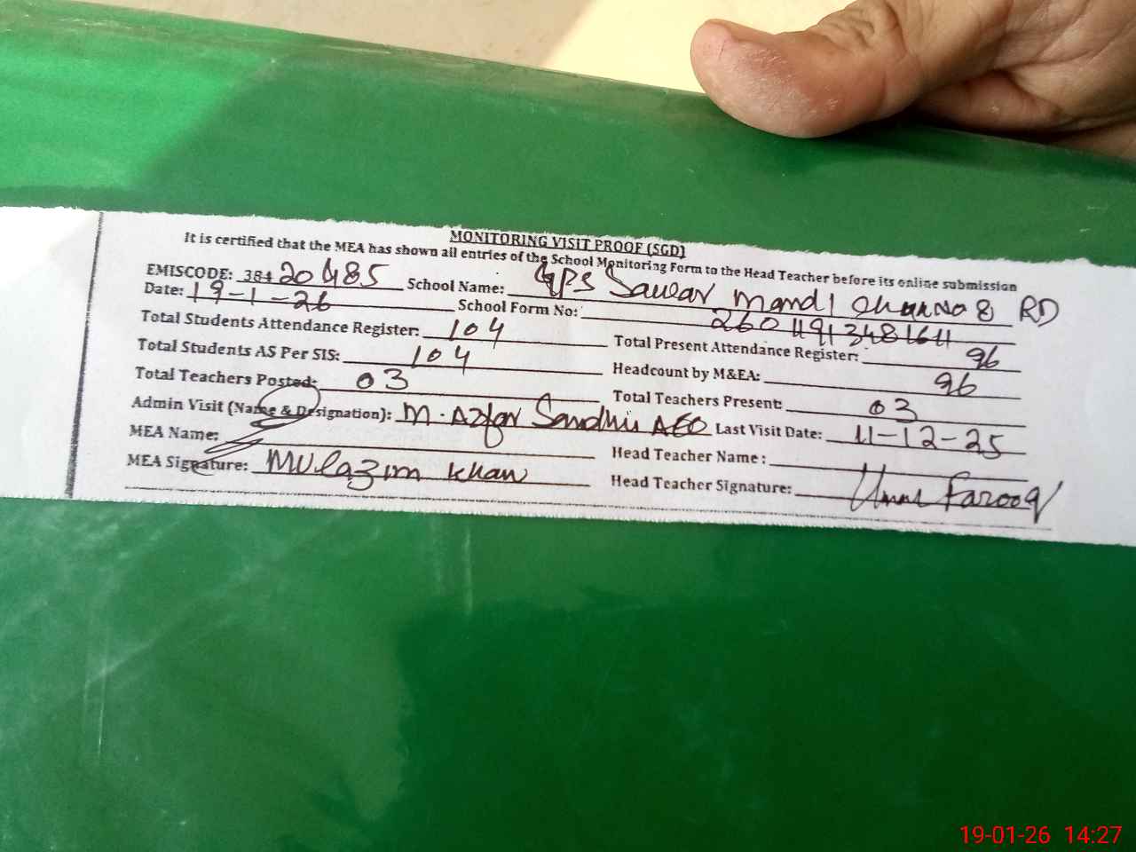 | Attendance Register | Head Teacher | MEA with School | Visit Proof |