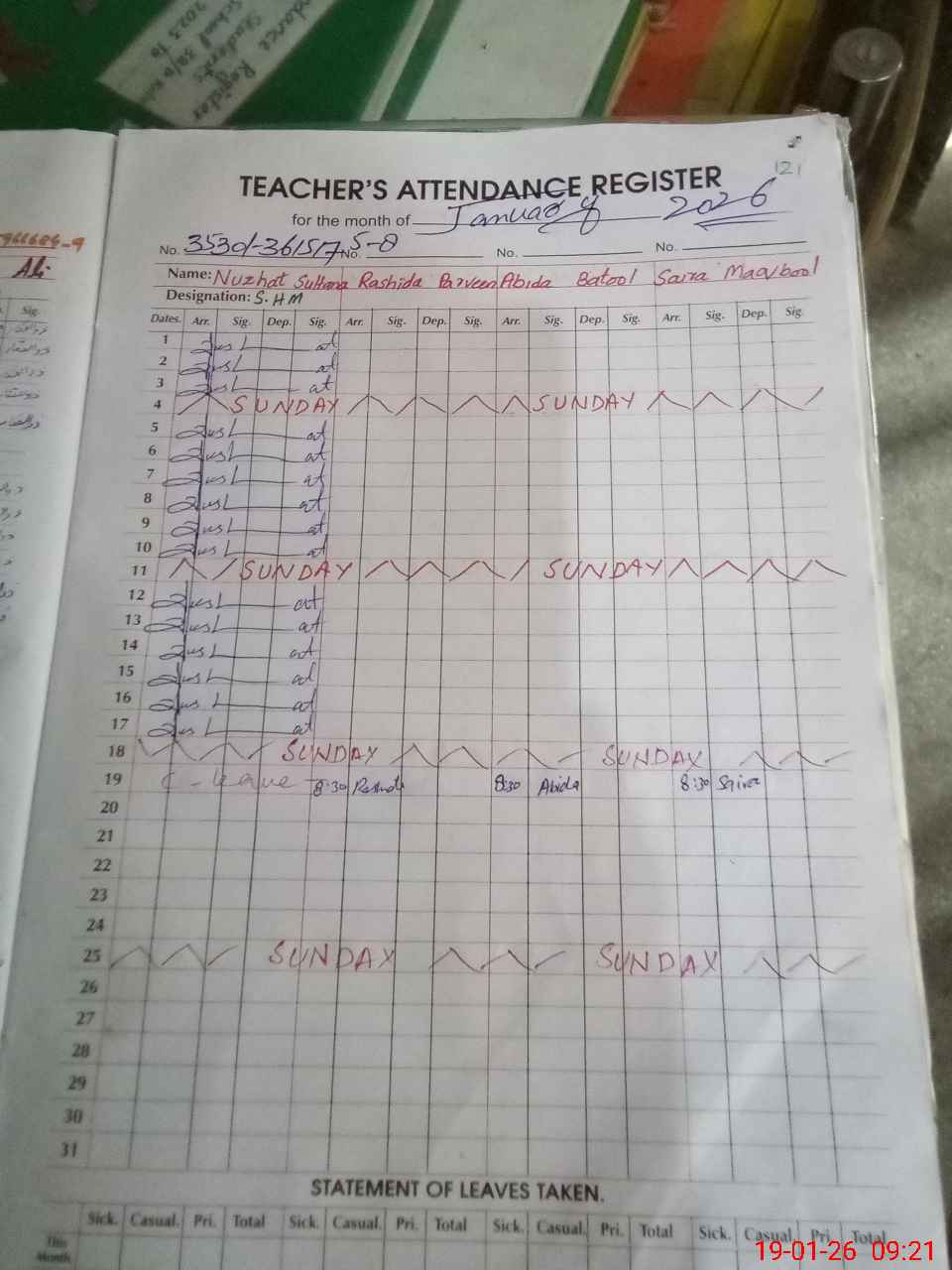 | 35**** | Nu**** Su**** | Sr. Headmaster | Regular | 0 | 0 | 0 | 0 | 0 | 0 | 0 | 0 | 0 | Casual |